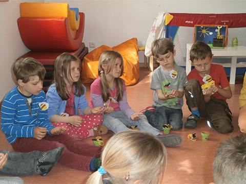 Erst erinnern wir uns gemeinsam daran, wie eine Biene ausÂsieht - wir wollen noch wissen, was sie so den ganzen Tag macht. Frau Scheuring erzählt es uns und wir spielen nach, wie der Pollen in den Bienenstock kommt.