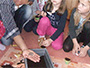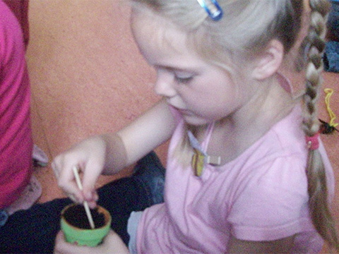 Heute zeichnet ein Teil von uns einige Aufgaben der Biene auf unser großes Plakat und gleichzeitig füllen die anderen KinderÂgartenkinder Erde in kleine Töpfchen ein.